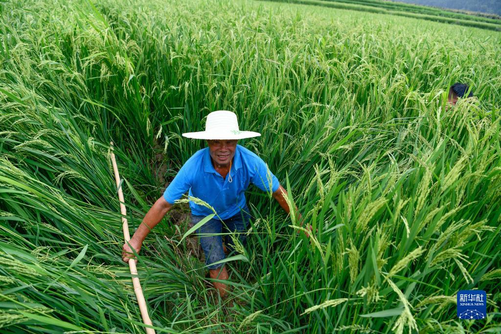 8月1日,農民在貴州省岑鞏縣水尾鎮新場村雜交水稻制種基地利用竹竿進行人工“趕花”授粉。