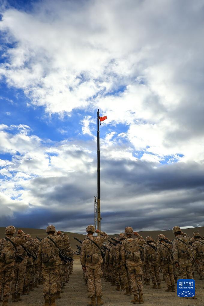 8月1日,新疆軍區某合成團在喀喇昆侖高原舉行升國旗儀式,官兵們在五星紅旗下重溫軍人誓詞。