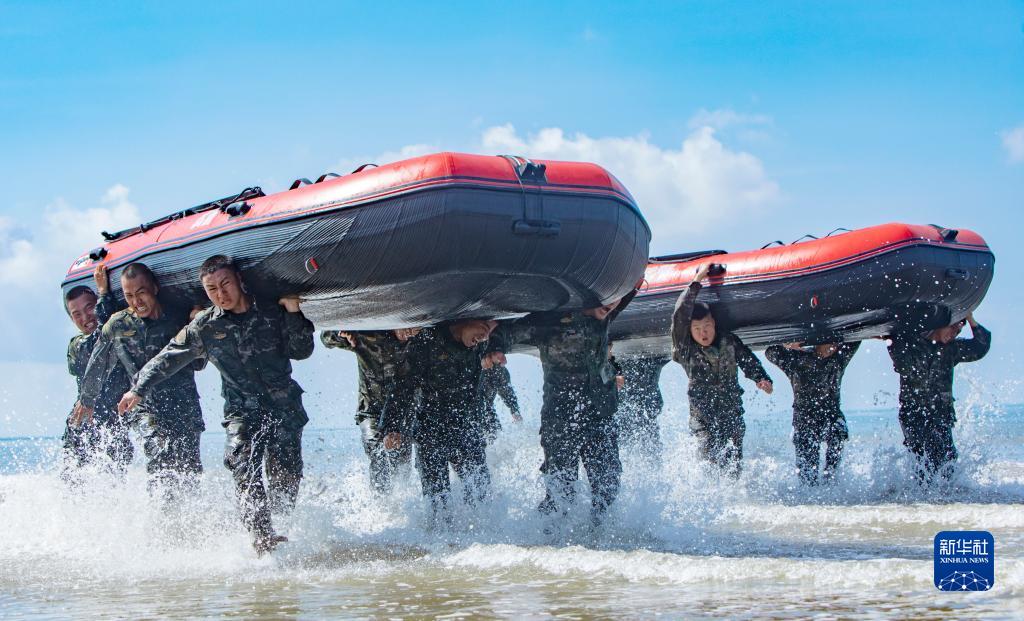 武警廣西總隊防城港支隊官兵組織扛舟行進訓練(7月31日攝)。