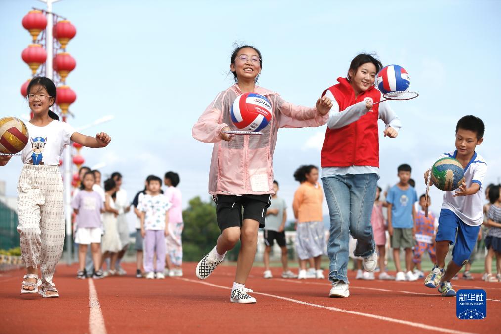 8月1日,在即墨區龍山街道前東葛村新時代文明實踐站,大學生志愿者與學生們一起玩“托球跑”游戲。