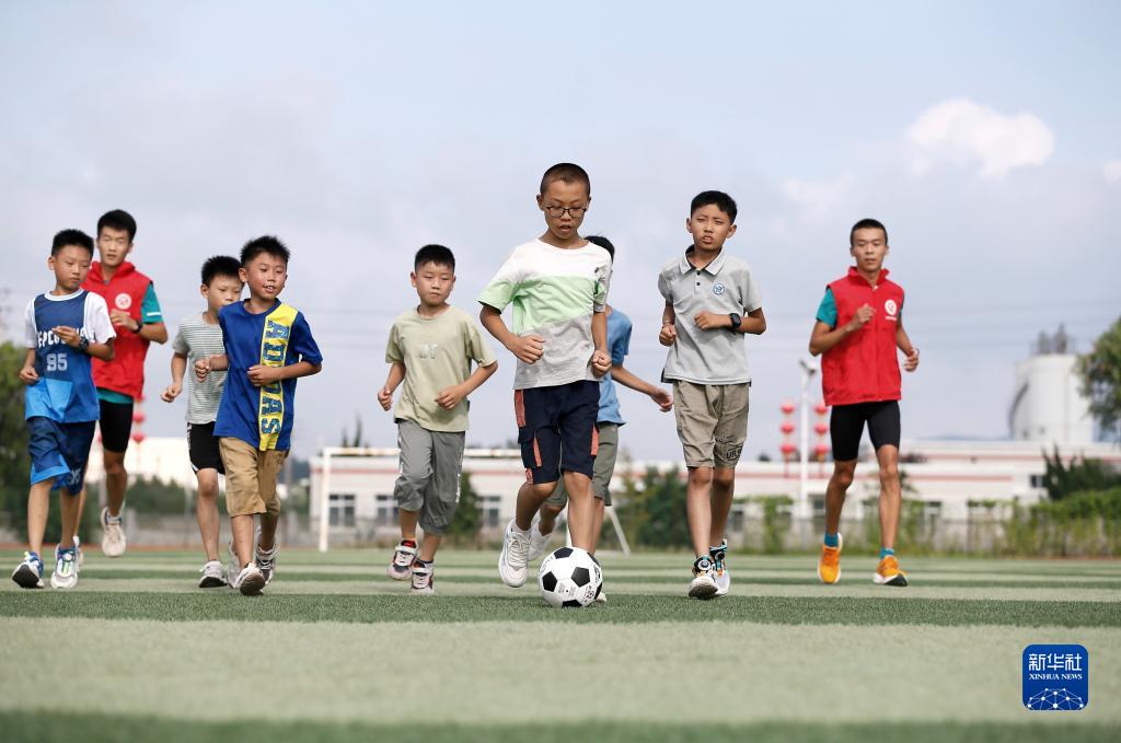 8月1日,在即墨區龍山街道前東葛村新時代文明實踐站,大學生志愿者與孩子們一起踢足球。