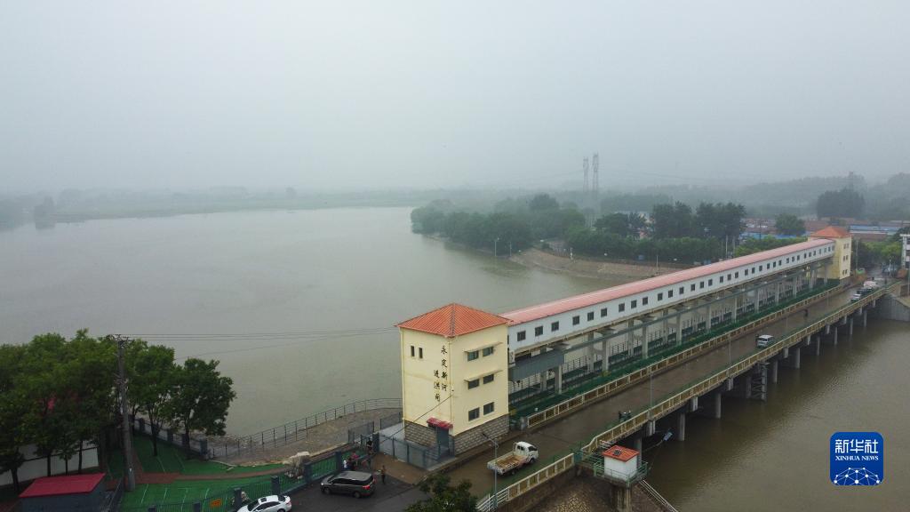 這是8月1日在海河流域永定河下游拍攝的永定新河進洪閘現場(無人機照片)。