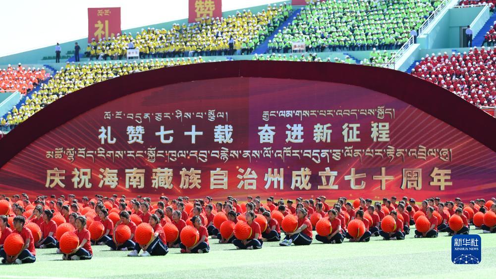 當日,青海省海南藏族自治州舉行慶祝成立70周年大會。海南州民族體育場彩旗飄飄,歌聲悠揚,各族群眾身著盛裝,滿懷喜悅。