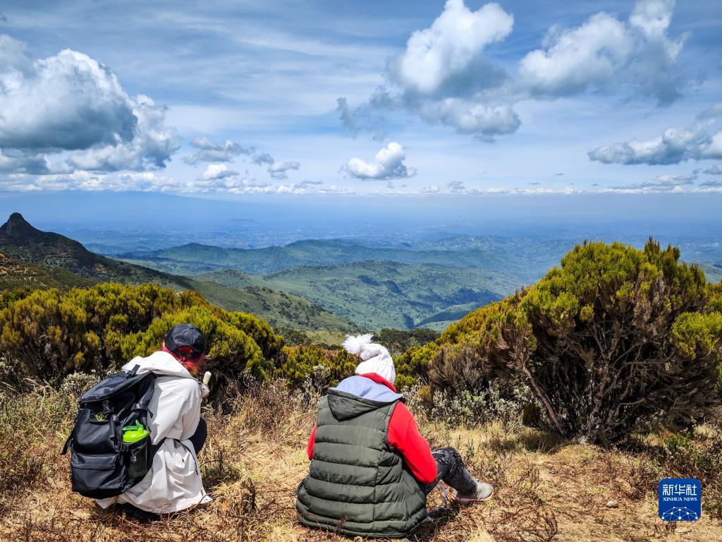 這是3月18日,兩名游客在肯尼亞阿伯德爾國家公園的象山上欣賞風景。