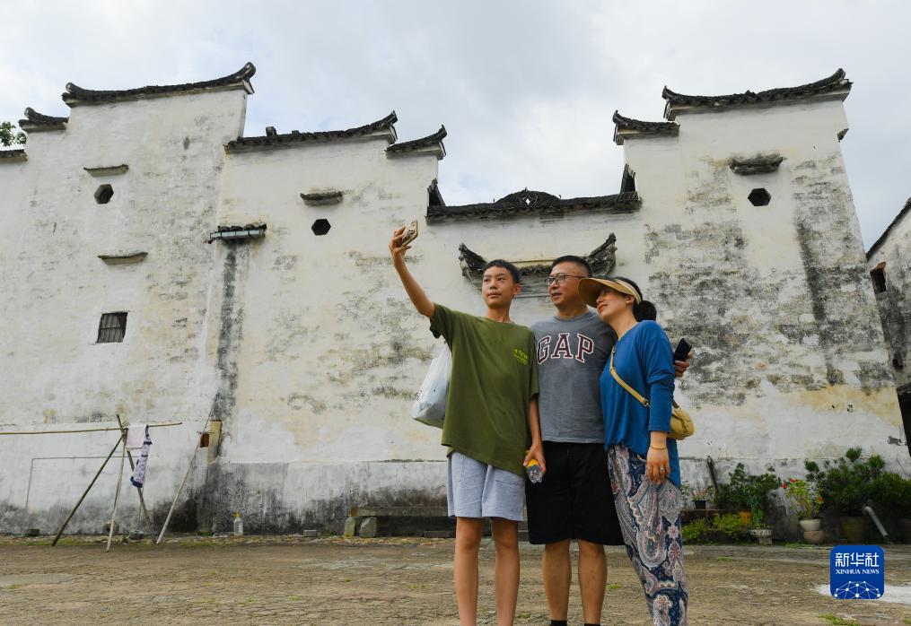 8月1日,游客在諸葛村老建筑間留影。
