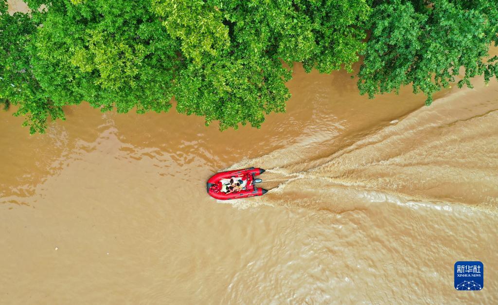 8月2日,救援人員在河北省涿州市市區內轉移群眾(無人機照片)。