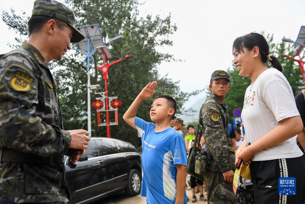 8月2日,在北京市門頭溝區妙峰山鎮,在乘坐車輛轉移前,武天騏(中)向武警北京總隊機動三支隊的王雷鳴敬禮感謝。
