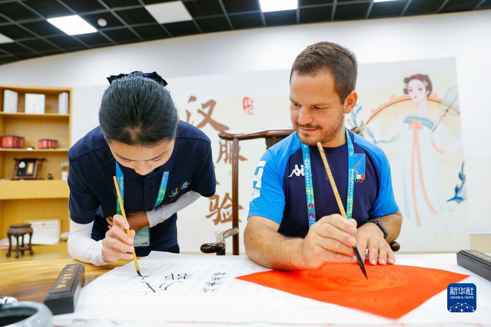 成都大運村里設置了書法、國畫、蜀繡、傳統樂器等豐富多彩的中國文化互動體驗項目。運動員和教練員在休息之時,紛紛前來感受中國文化的魅力,了解學習中國文化。
