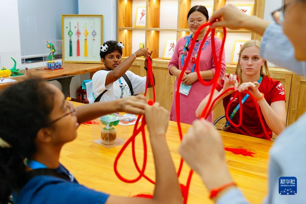 7月31日,在成都大運村,幾名外國代表團成員學習制作中國結。