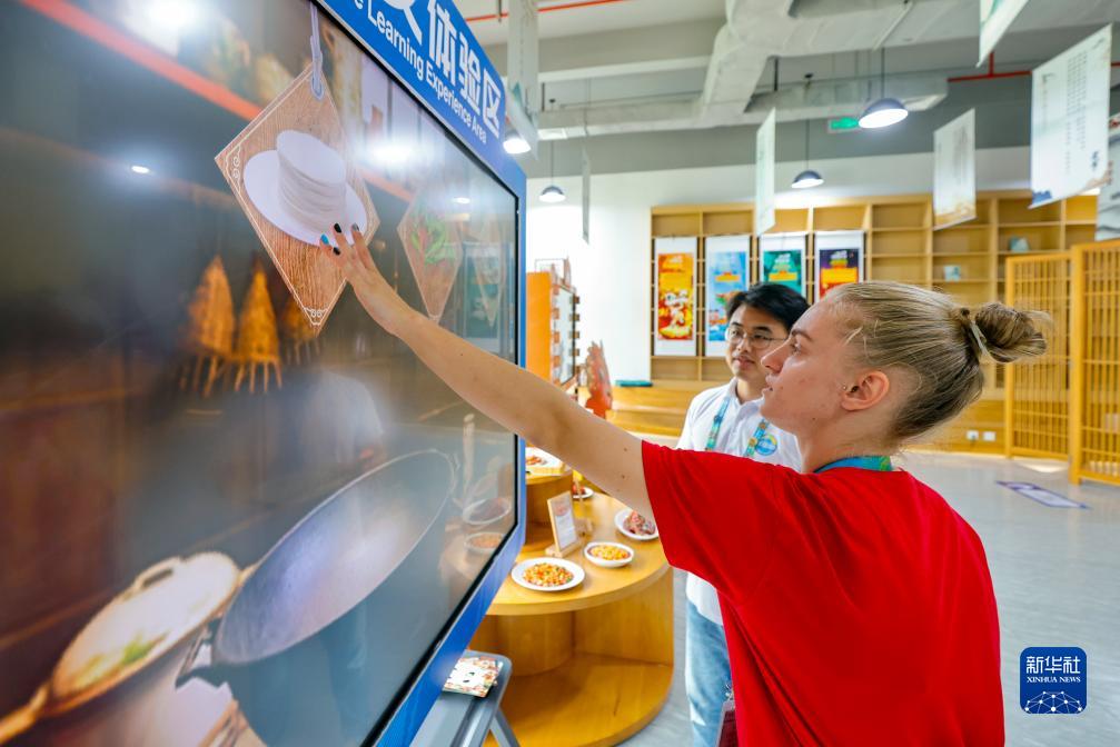 7月31日,在成都大運村的“漢語橋”中文學習互動體驗區,羅馬尼亞運動員斯特凡妮婭-帕特里夏·克蒂內安通過數字互動電子屏學習做中國菜。