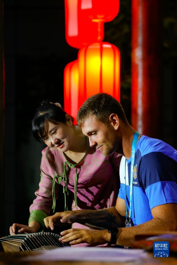 7月31日,在成都大運村,四川音樂學院中華傳統音樂研究院研究員王婷在教摩爾多瓦運動員亞歷山大·布洛特體驗古琴演奏技法。
