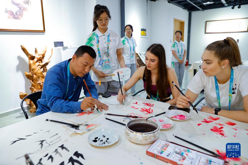 成都大運村里設置了書法、國畫、蜀繡、傳統樂器等豐富多彩的中國文化互動體驗項目。運動員和教練員在休息之時,紛紛前來感受中國文化的魅力,了解學習中國文化。