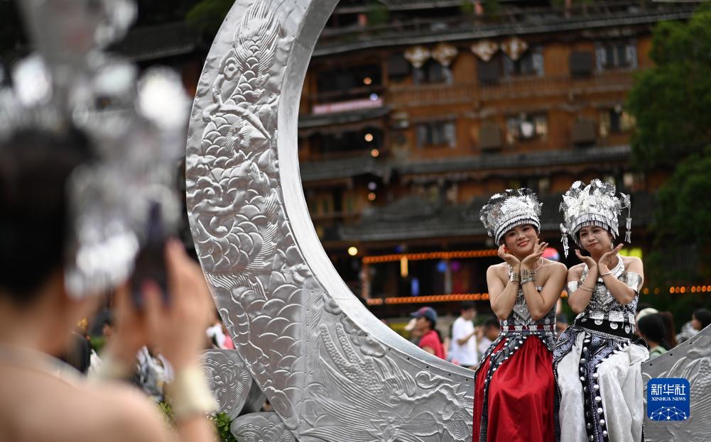 8月1日,游客在貴州省黔東南苗族侗族自治州雷山縣西江千戶苗寨景區游覽拍照。