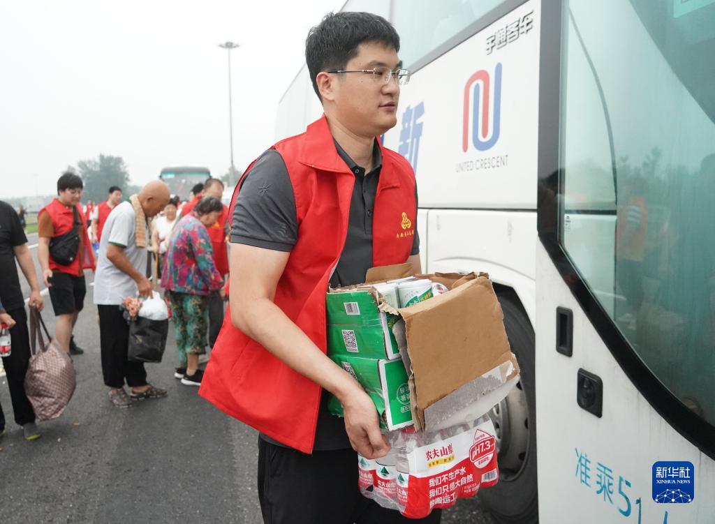 8月2日,在北京市房山區的京港澳高速琉璃河出口,志愿者為受災群眾搬運食品和飲用水。