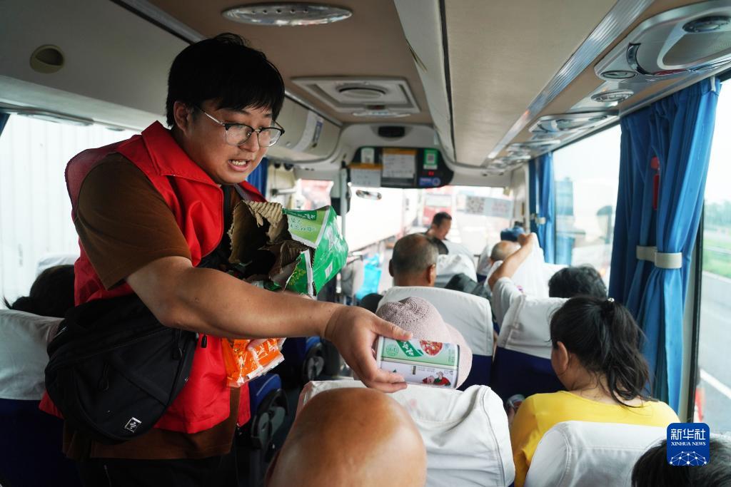 8月2日,在北京市房山區的京港澳高速琉璃河出口,志愿者在轉運車輛上向受災群眾發放食品。