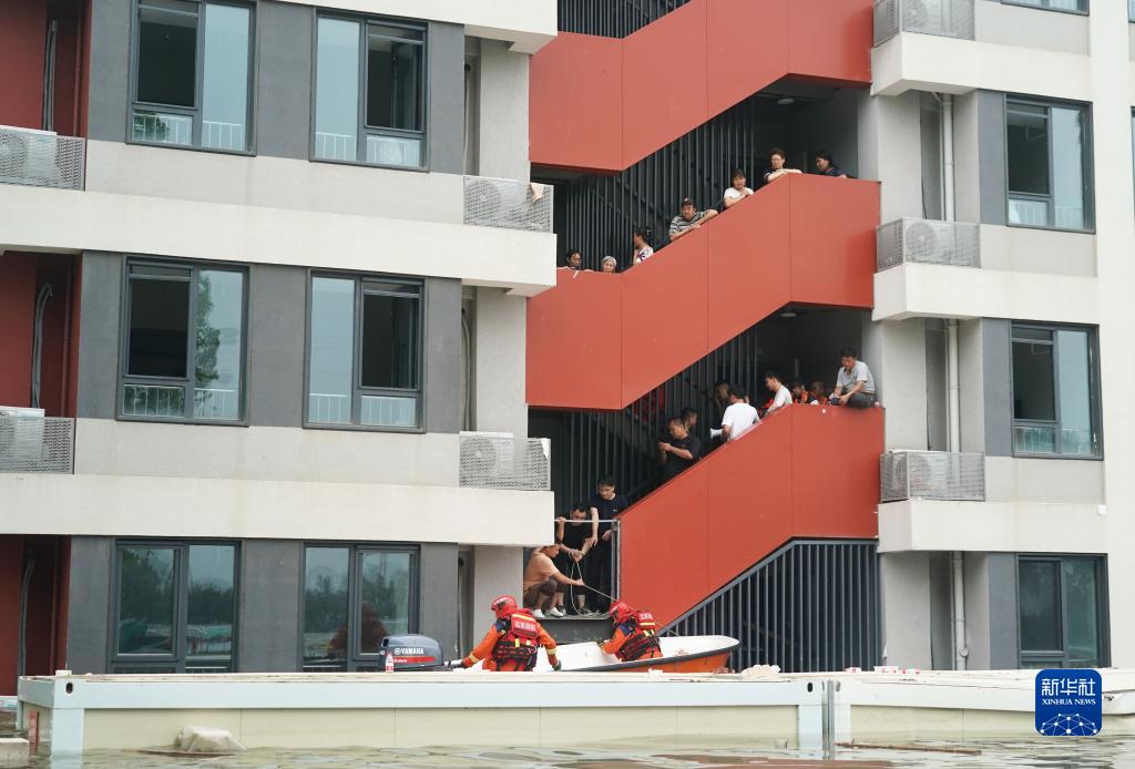 8月2日,在北京市房山區琉璃河鎮平各莊村,消防員駕駛沖鋒舟轉移受災群眾。