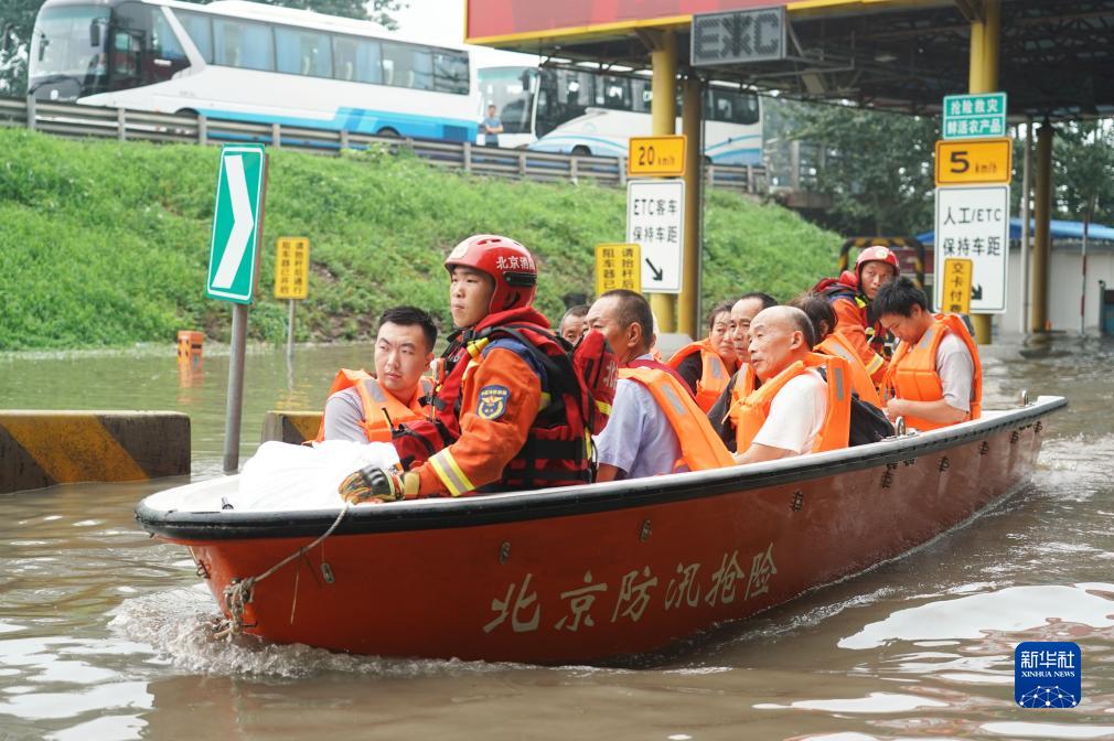 8月2日,在北京市房山區的京港澳高速琉璃河出口,受災群眾乘坐沖鋒舟前往轉運車輛乘車點。