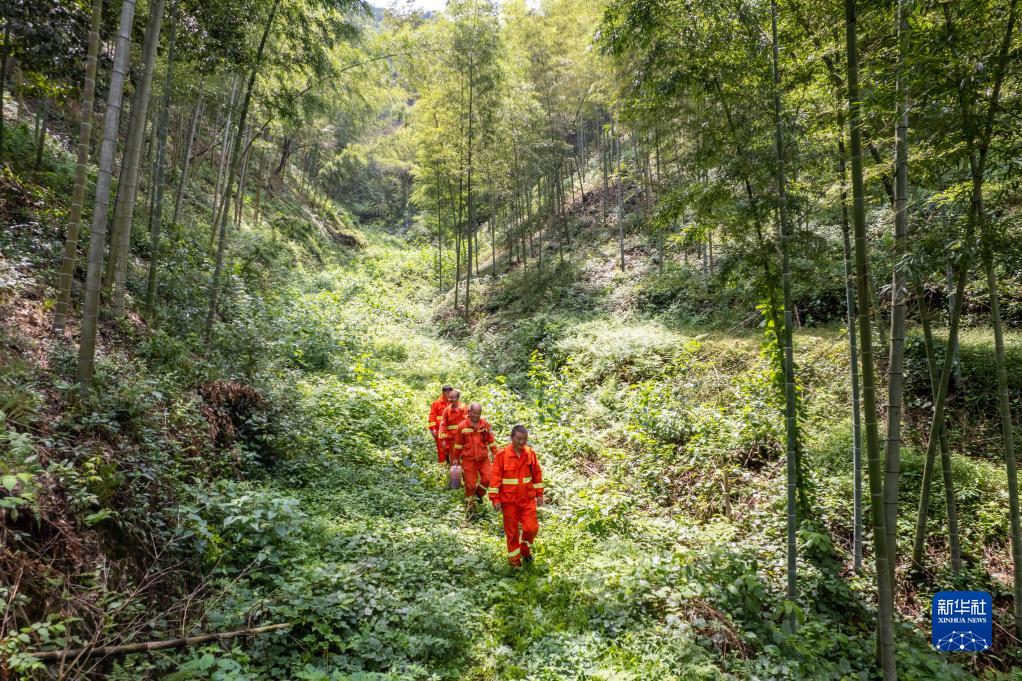 8月2日,在桃江縣桃花江國有林場,護林員在竹林尋找竹蝗產卵地(無人機照片)。