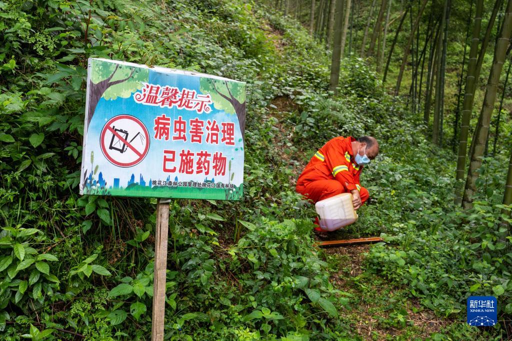8月2日,在桃江縣桃花江國有林場,護林員在誘殺裝置中施放治理竹蝗的藥水。