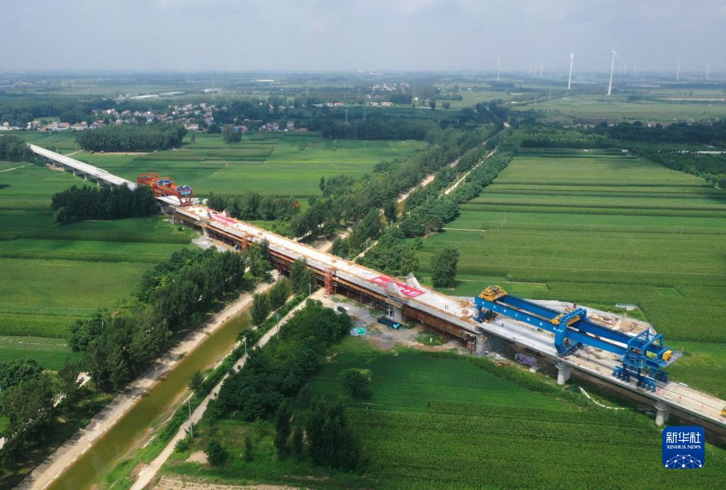 8月2日,架橋機在菏蘭高鐵蘭考特大橋上進行箱梁架設作業(無人機照片)。