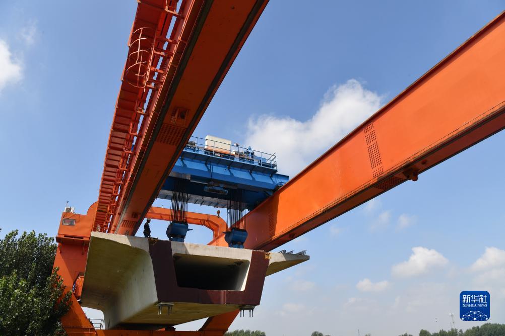 8月2日,架橋機在菏蘭高鐵蘭考特大橋上進行箱梁架設作業。