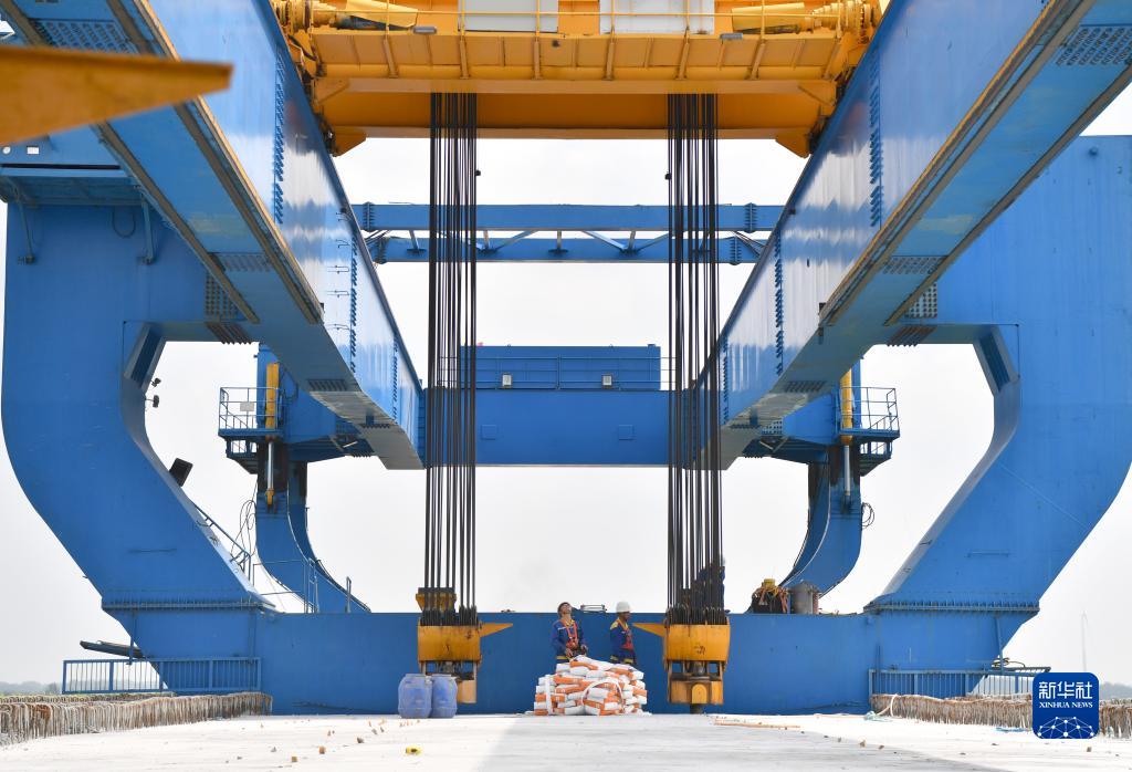 8月2日,架橋機在菏蘭高鐵蘭考特大橋上進行箱梁架設作業。
