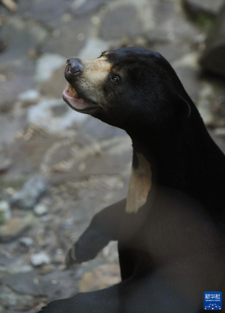 8月2日,馬來熊在杭州動物園“直立”與游客互動。