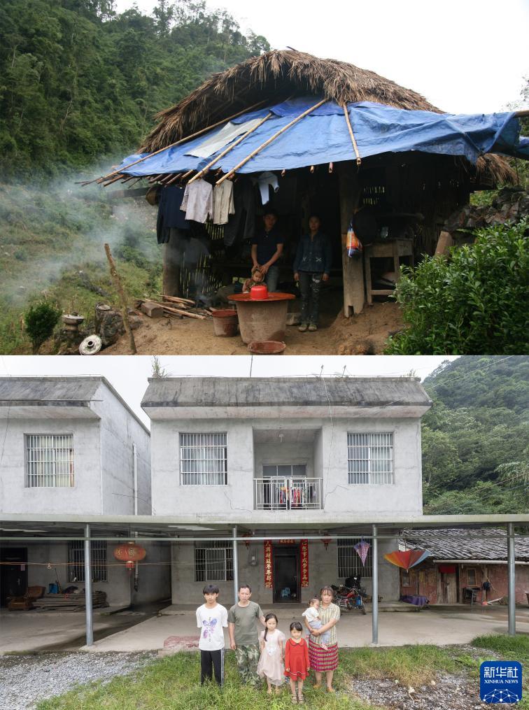 這是一張拼版照片:上圖為2008年11月14日,陶文學(前左)和父母一起站在茅草屋前合影(新華社記者張愛林攝);下圖為2023年7月30日,陶文學(左一)和父親陶建明(左二)以及繼母和三個妹妹在新居前合影(新華社記者費茂華攝)。