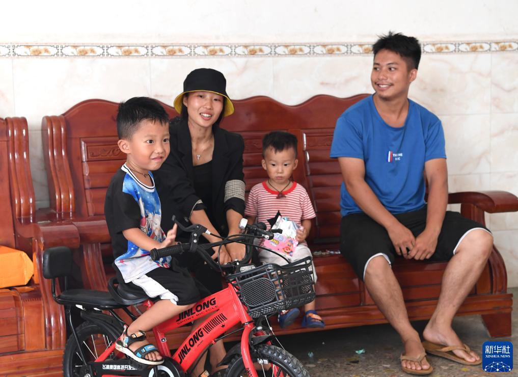 7月31日,吳星海(右一)在那坡縣百南鄉甲柳村上保屯和家人享受休閑時光。新華社記者周華攝