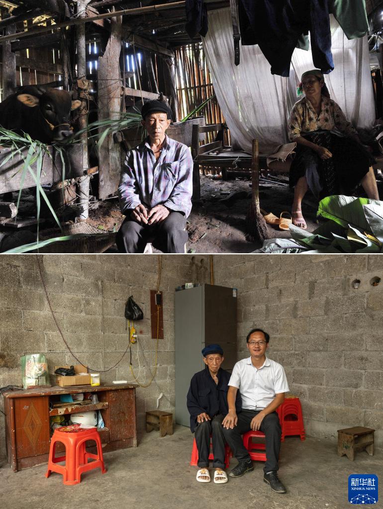 這是一張拼版照片:上圖為2009年7月14日,陶文勝和妻子在茅草屋中合影(新華社記者張愛林攝);下圖為2023年7月31日,陶文勝與外孫吳建英在新居中合影(新華社記者費茂華攝)。新華社發