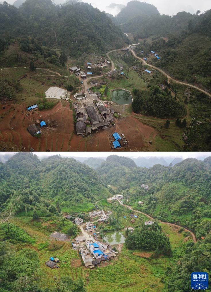 這是一張拼版照片:上圖為2018年3月18日拍攝的水弄屯二社的磚瓦房(無人機照片);下圖為2020年10月16日,改造成鋼筋水泥新居后的水弄屯二社(無人機照片)。新華社記者張愛林攝