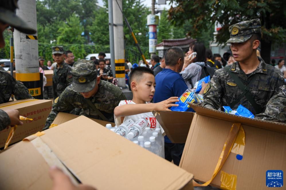 8月2日,在北京市門頭溝區妙峰山鎮政府附近,武警北京總隊機動三支隊官兵為K396次列車旅客分發食物和水。