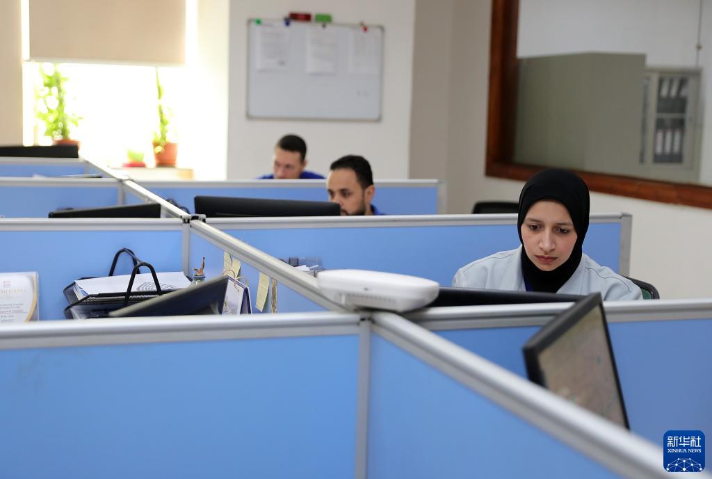 6月26日,在埃及蘇伊士,巨石埃及計調物流部副經理迪娜(右)在辦公室工作。