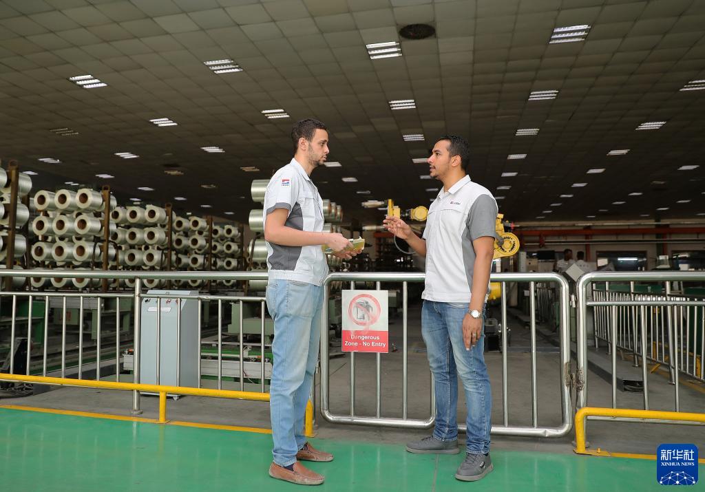 6月26日,在埃及蘇伊士,巨石埃及公司副總經理蘇萊曼(右)在生產車間同員工交流。