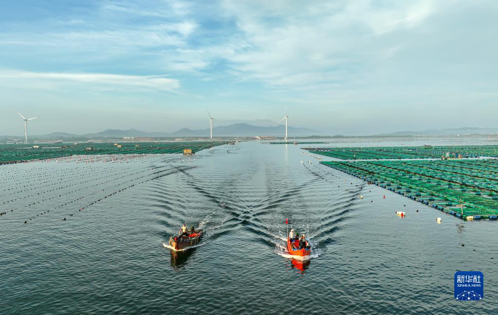 8月2日,在榮成市石島管理區桑溝灣海洋牧場,漁民們駕駛漁船前往生態養殖區作業(無人機照片)。