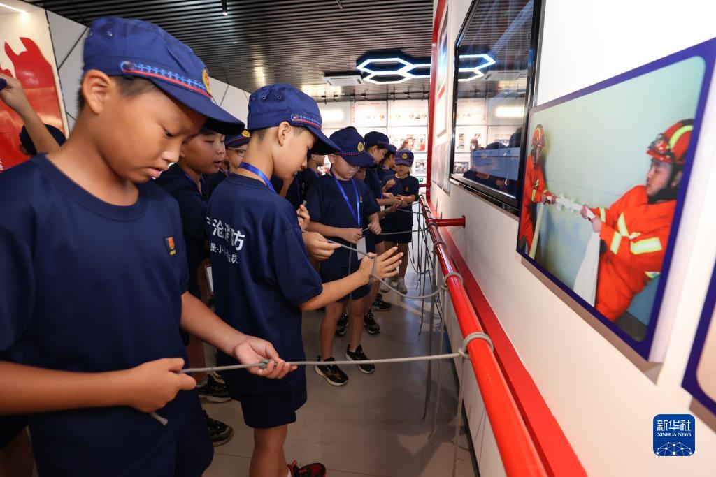 8月2日,在福建省廈門市消防科技教育館,小學生在學習救生結繩法。