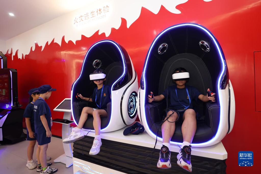 8月2日,在福建省廈門市消防科技教育館,小學生通過消防VR設備體驗火災逃生。