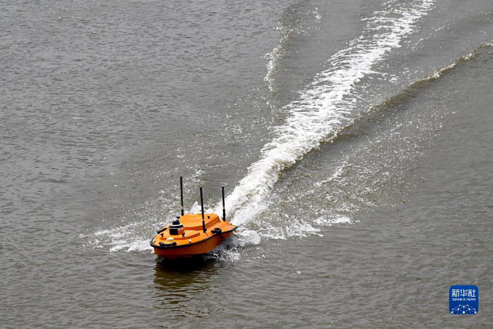 8月2日,一艘無人水文監測船在天津獨流減河進洪閘上游航行監測。