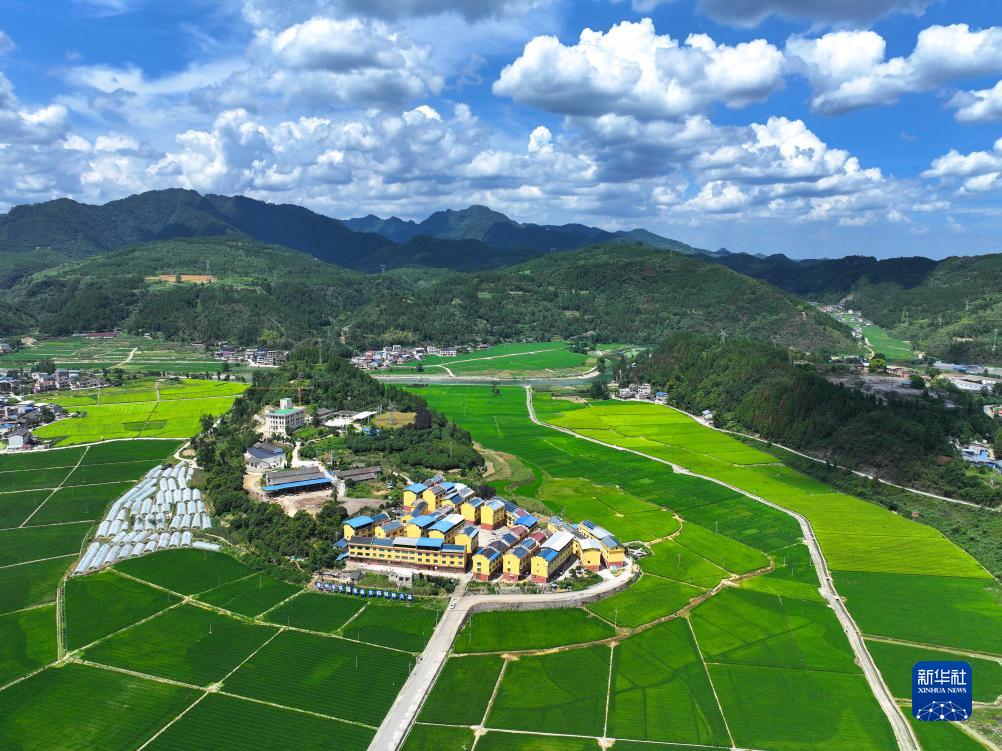 這是8月1日在貴州省岑鞏縣思旸鎮磨寨村拍攝的村莊與稻田(無人機照片)。