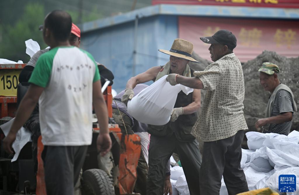 8月3日,抗洪人員在天津市西青區辛口鎮子牙河岸邊搬運沙袋。