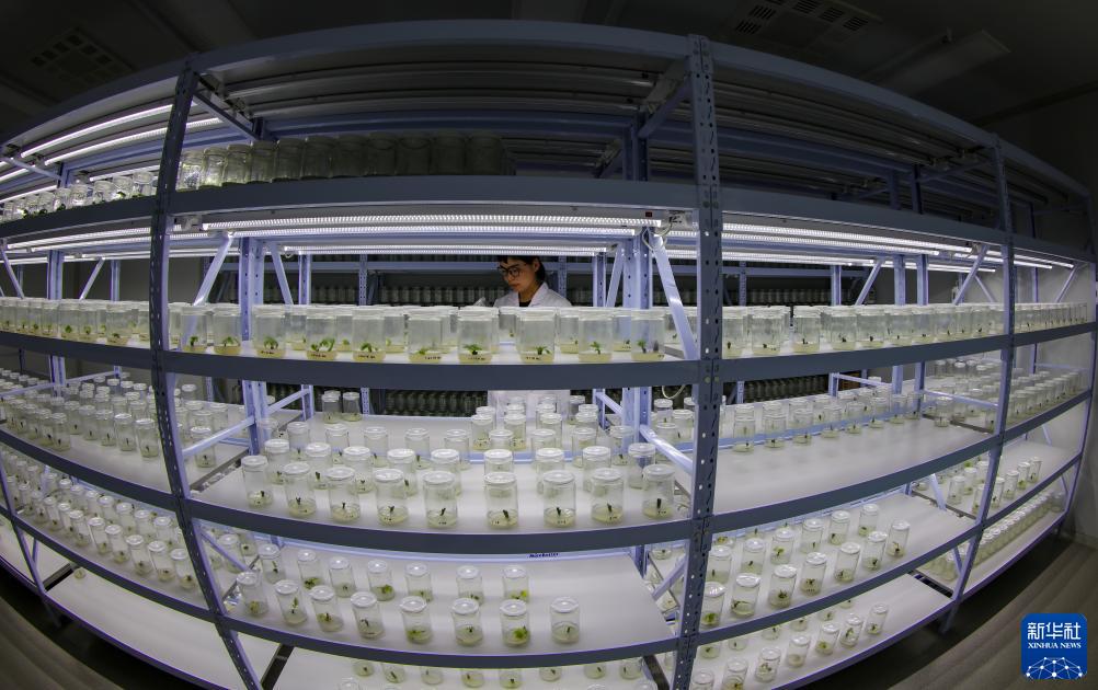 劉利平博士在高原核桃研究所檢查核桃組織培養標本(7月27日攝)。
