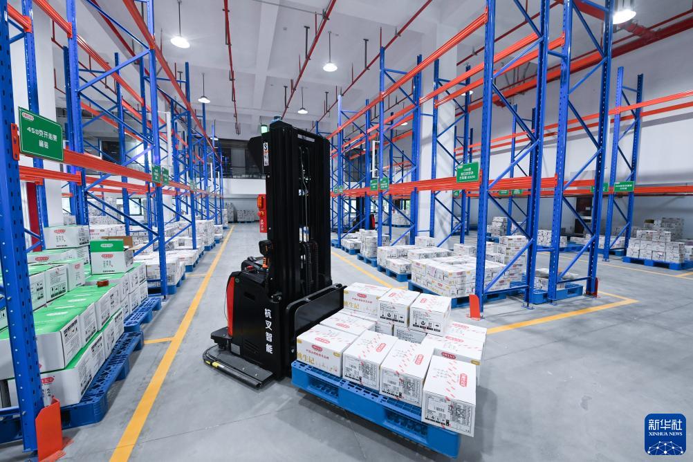 8月3日,全自動智能叉車在杭州市臨安區龍崗鎮一家堅果企業的數字化車間倉庫內碼放貨物。