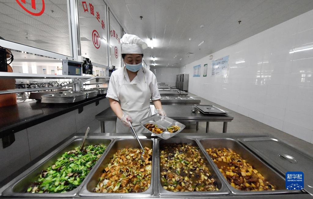 8月3日,在天津市靜海區第六中學臨時安置點,工作人員為轉移群眾準備午飯。