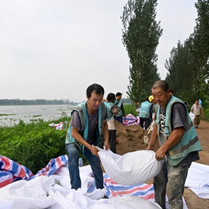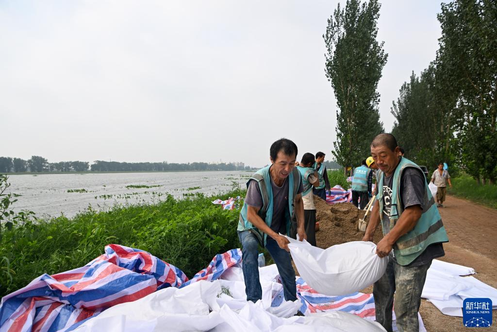 當日,來自中建、中交等多個單位的工人和靜海區當地村民共千余人忙碌在大清河天津市靜海段南北兩岸,持續進行兩岸堤壩加高加固工作,以應對大清河河道內不斷增長的上游來水。