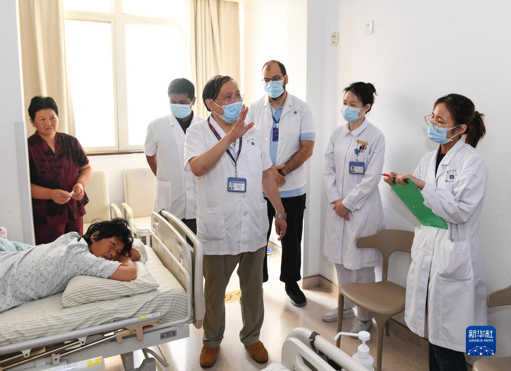 8月1日,在江蘇省人民醫院消化內鏡科病房,主任醫師范志寧(右四)帶著來自埃及艾因夏姆斯大學醫院、中埃聯合培養的博士生穆罕默德·哈斯基亞(右三)等查房