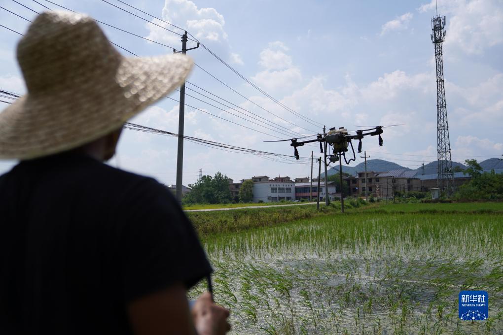 江西省新余市分宜縣的農戶操作無人機噴灑葉面肥(8月3日攝)。