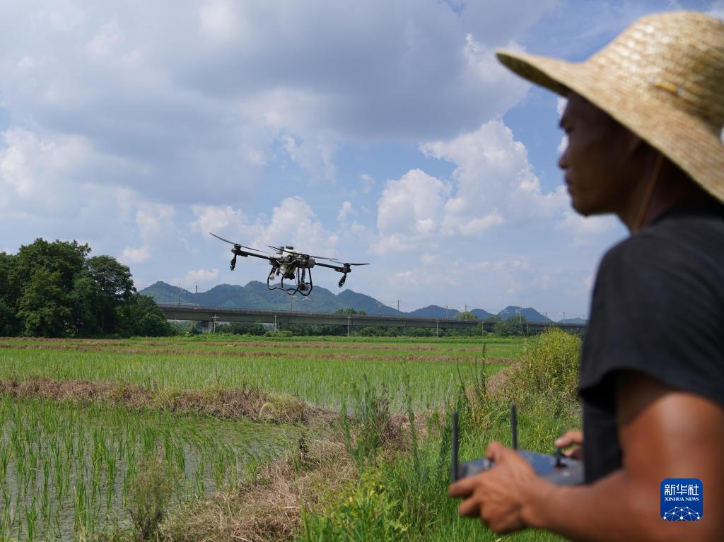 江西省新余市分宜縣的農戶操作無人機噴灑葉面肥(8月3日攝)。