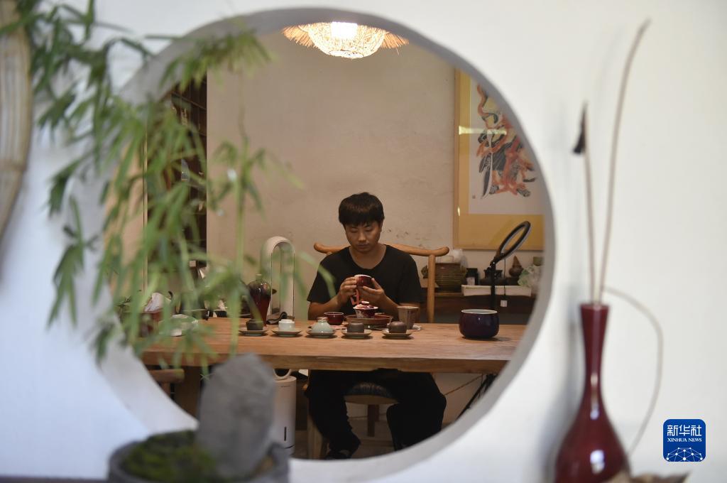 8月3日,在河南省禹州市神垕鎮槐樹灣村陶瓷創客基地,鈞瓷藝人丁祥在自己的工作室里查看燒制完成的鈞瓷作品。