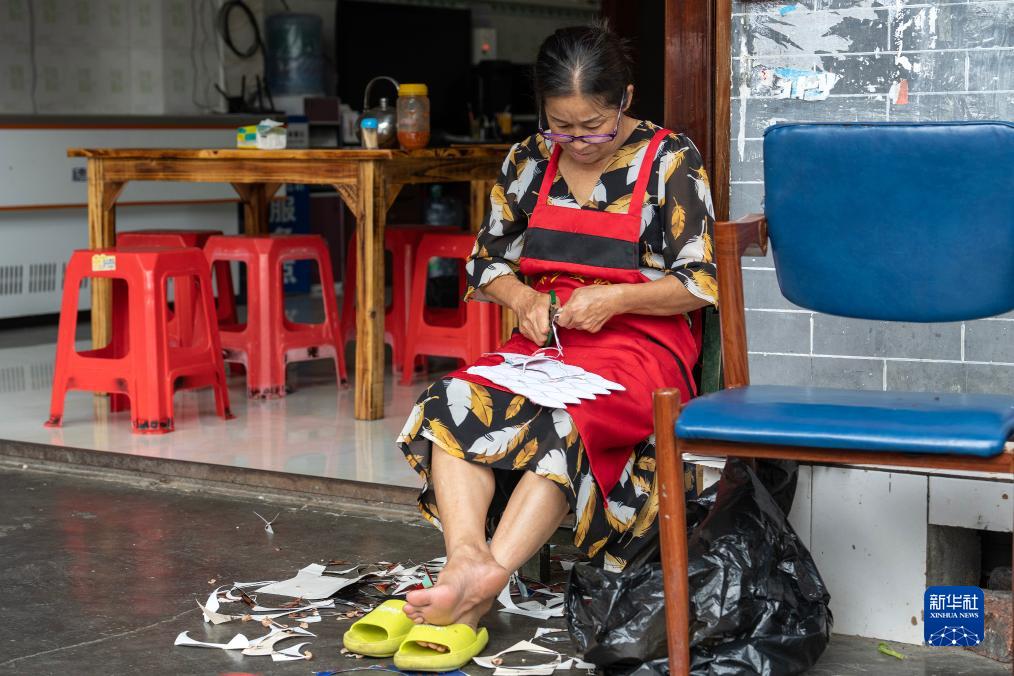 8月2日,在靖西市舊州村,一名開飯館的村民在制作繡球。
