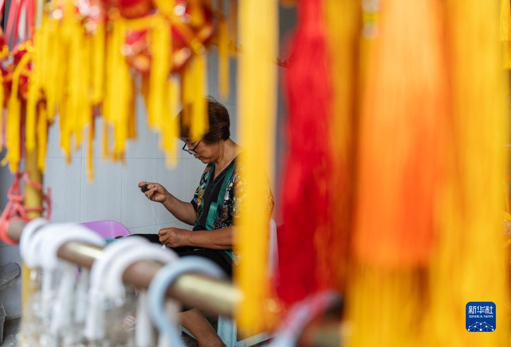 8月2日,在靖西市舊州村,一名村民在制作繡球。
